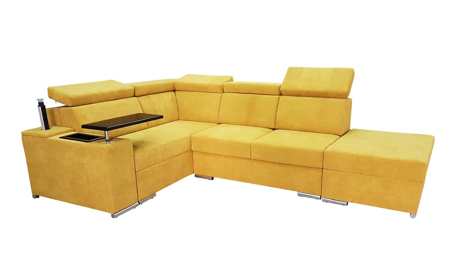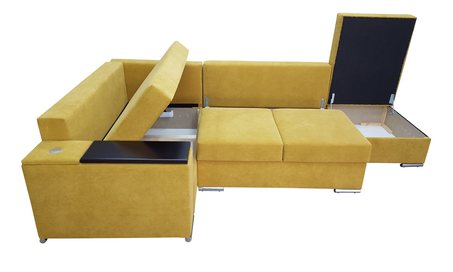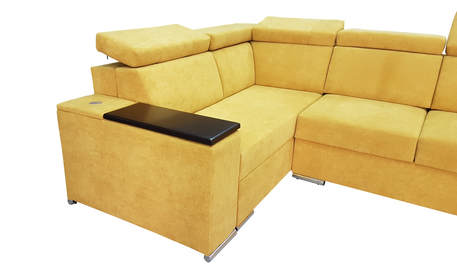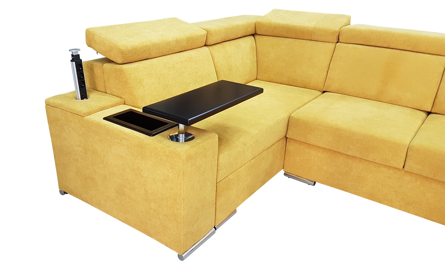 Opcja ta pozwala nam poprzez naciśniecie blatu zmienić podłokietnik w miejsce pracy lub rozrywki. Drewniany blat zamontowany jest na eleganckim chromowanym siłowniku. Dodatkowo bok ten wyposażony jest w wysuwane potrójne gniazdo 230v + 2x USB.