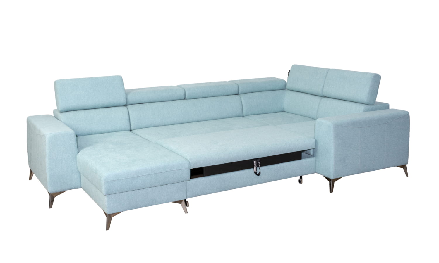 Duża powierzchnia użytkowa oraz praktyczne funkcje sprawiają, że model dobrze odnajduje się jako centralny element strefy wypoczynkowej. To propozycja dla osób, które szukają dużego narożnika o nowoczesnym charakterze i wygodnym codziennym zastosowaniu.
