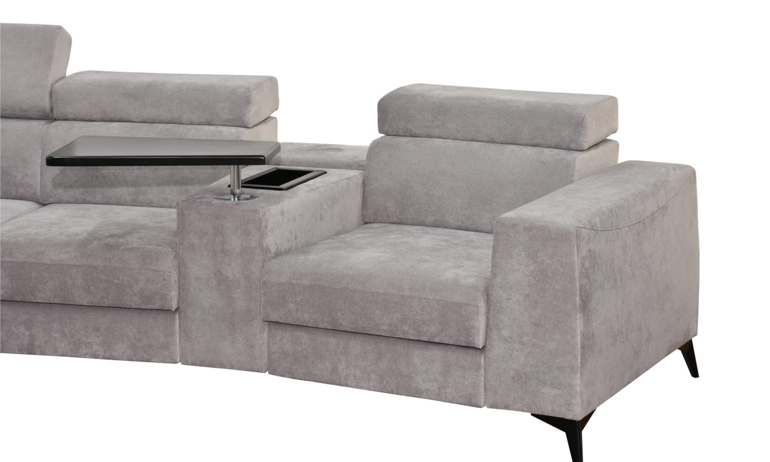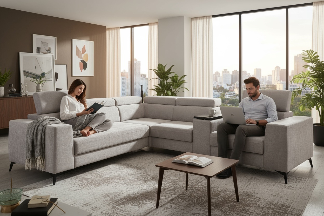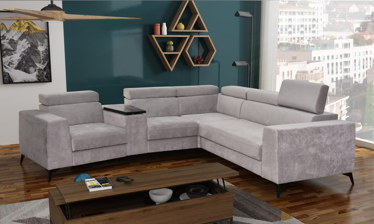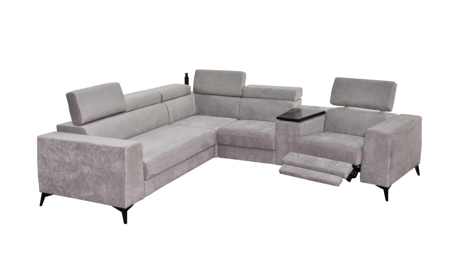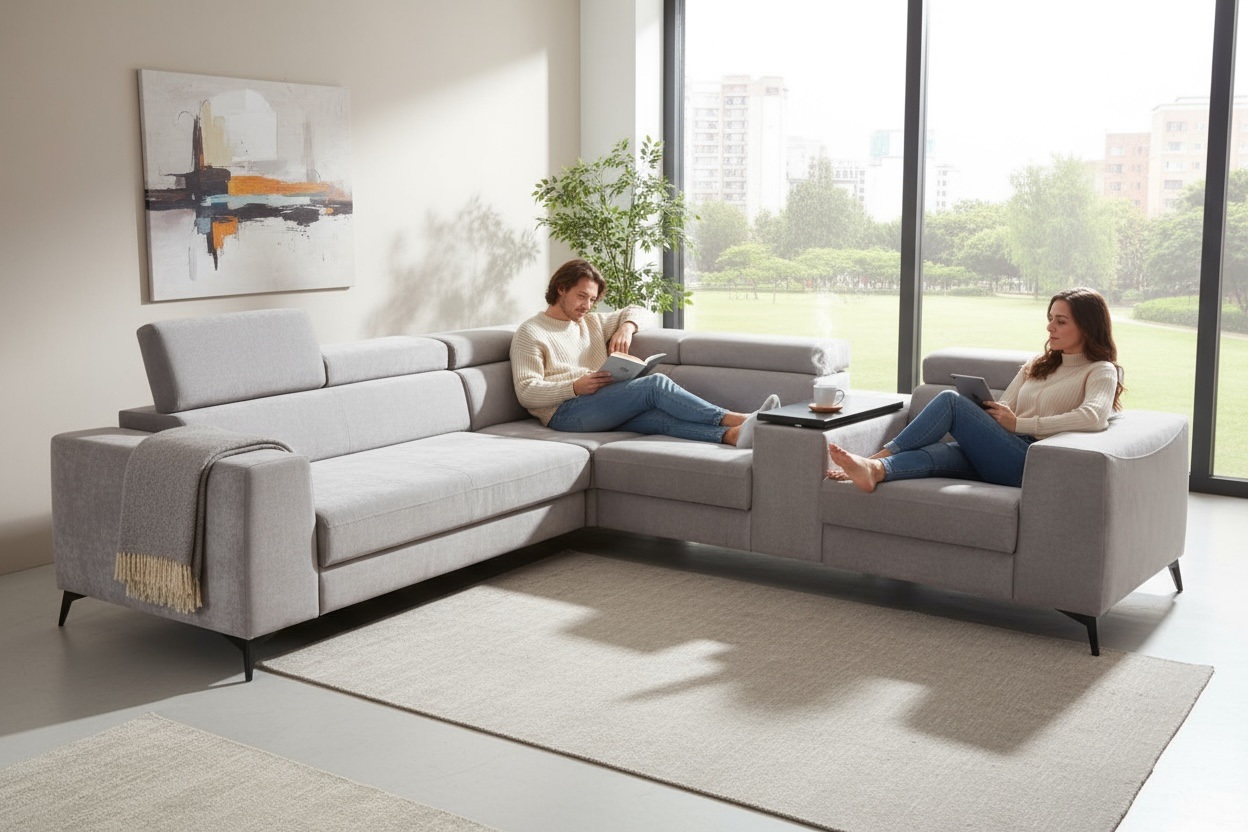 Narożnik OH Heron M10 to nowoczesny model wyposażony w funkcję spania, pojemnik na pościel, regulowane zagłówki oraz trapezowy barek z wysuwanym blatem pod laptopa. Dzięki wysokim metalowym nogom model prezentuje się lekko i elegancko, a jednocześnie oferuje praktyczne rozwiązania do codziennego wypoczynku.