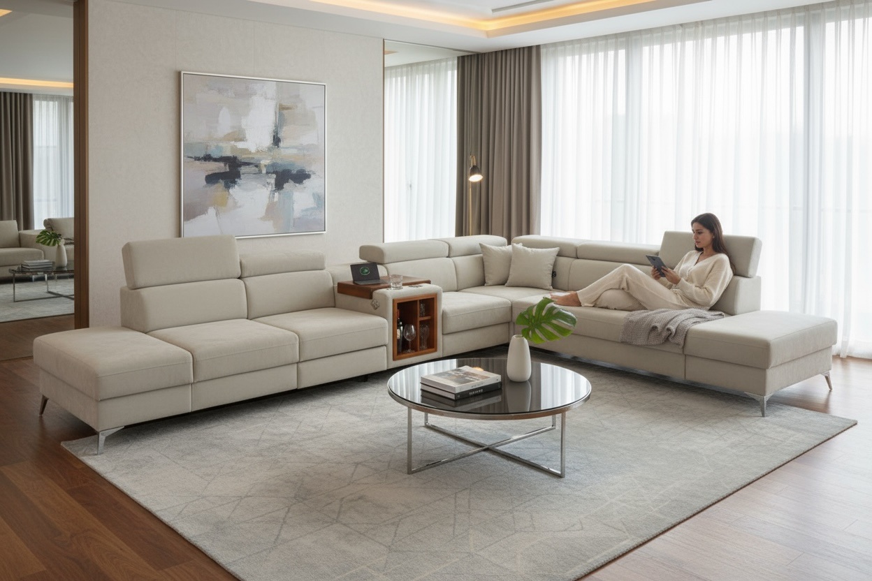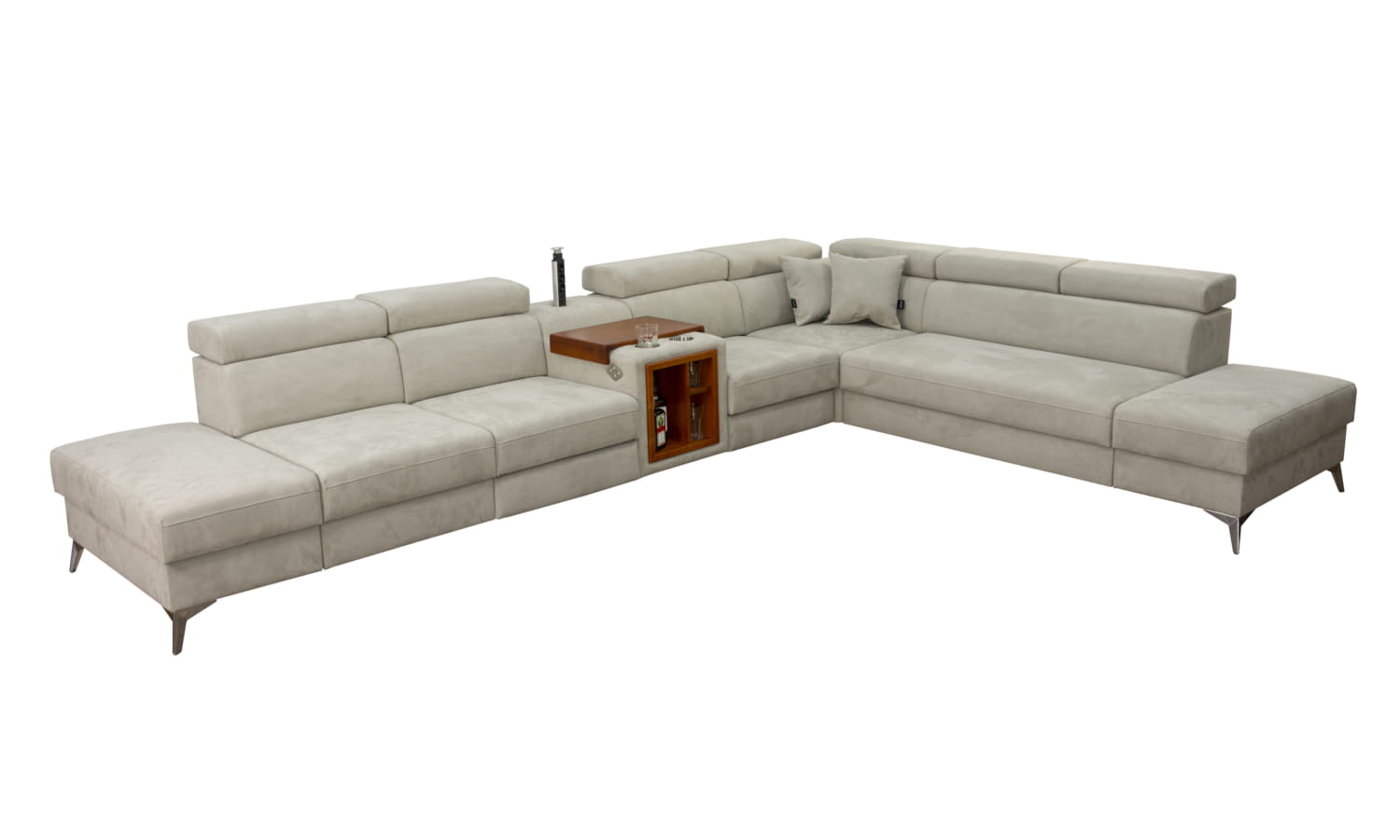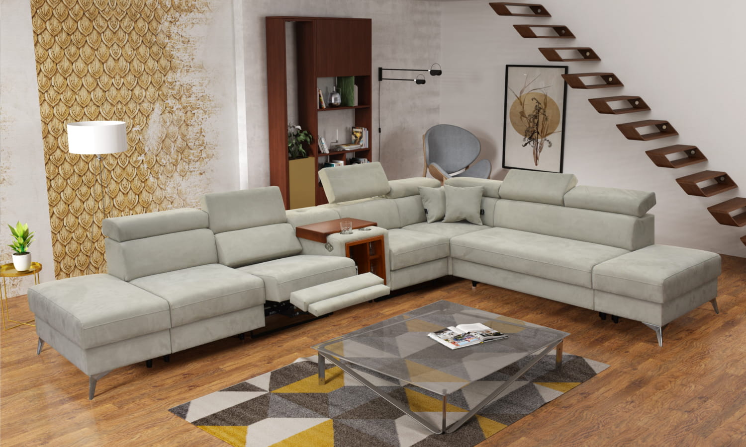 Duża powierzchnia użytkowa oraz praktyczne funkcje sprawiają, że model dobrze odnajduje się jako centralny element strefy wypoczynkowej. To propozycja dla osób, które szukają dużego narożnika o nowoczesnym charakterze i wygodnym codziennym zastosowaniu.