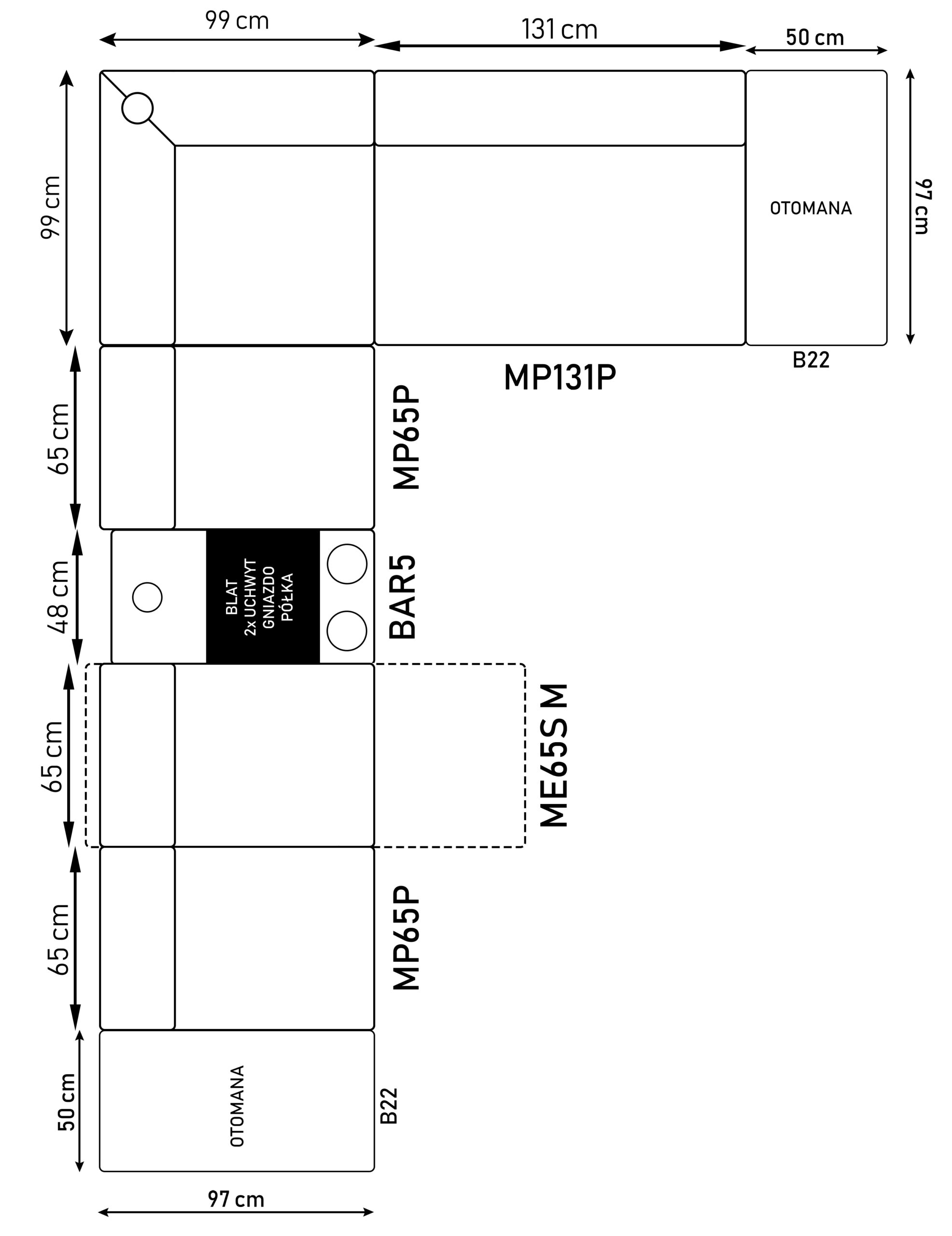 Stronę użytkowania określa bardziej wysunięty element narożnika, patrząc na mebel od frontu.