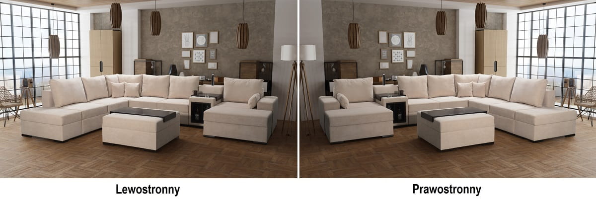 Stronę użytkowania określa bardziej wysunięty element narożnika, patrząc na mebel od frontu.