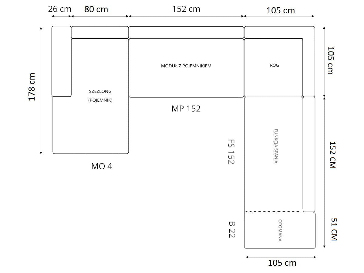 Stronę użytkowania określa bardziej wysunięty element narożnika, patrząc na mebel od frontu.