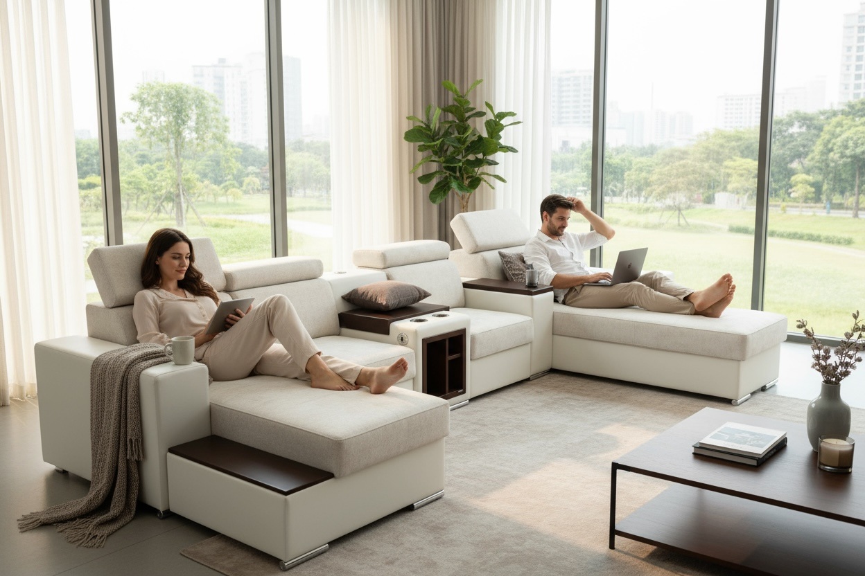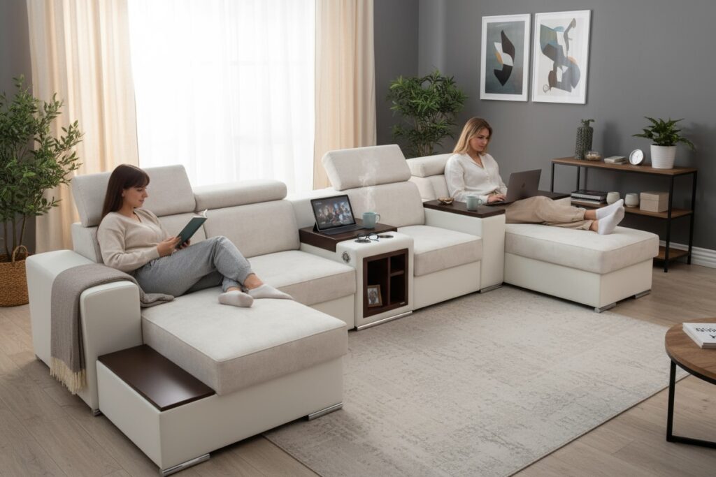 Narożnik OH Phoenix E2 to rozbudowany model premium przeznaczony do większych wnętrz. Łączy elegancki wygląd, wysoki komfort użytkowania oraz praktyczne rozwiązania, które zwiększają wygodę codziennego wypoczynku. To propozycja do przestronnego salonu, zarówno w nowoczesnym, jak i bardziej klasycznym stylu.