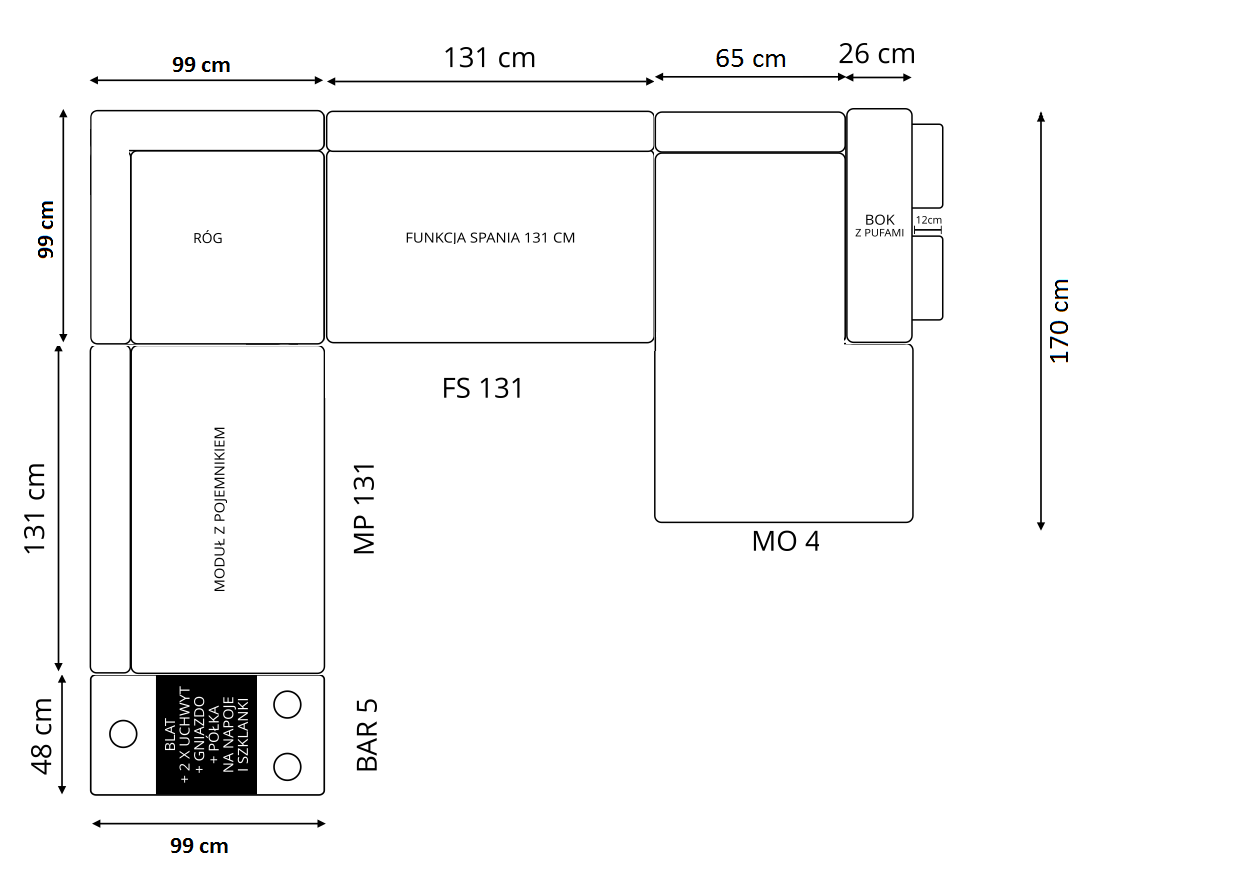 OH Phoenix M10 został wyposażony w barek, bok z pufami, funkcję spania, pojemnik na pościel oraz regulowane zagłówki. Dzięki temu model może pełnić rolę wygodnego narożnika do codziennego relaksu, a jednocześnie oferować praktyczne rozwiązania zwiększające komfort użytkowania. To dobra propozycja dla osób, które szukają mebla wygodnego, nowoczesnego i dobrze dopasowanego do codziennych potrzeb domowników.