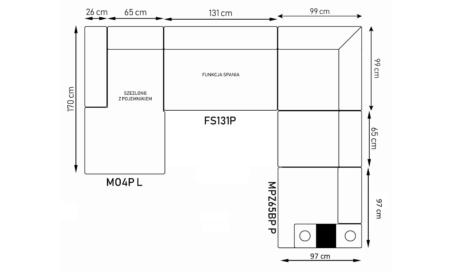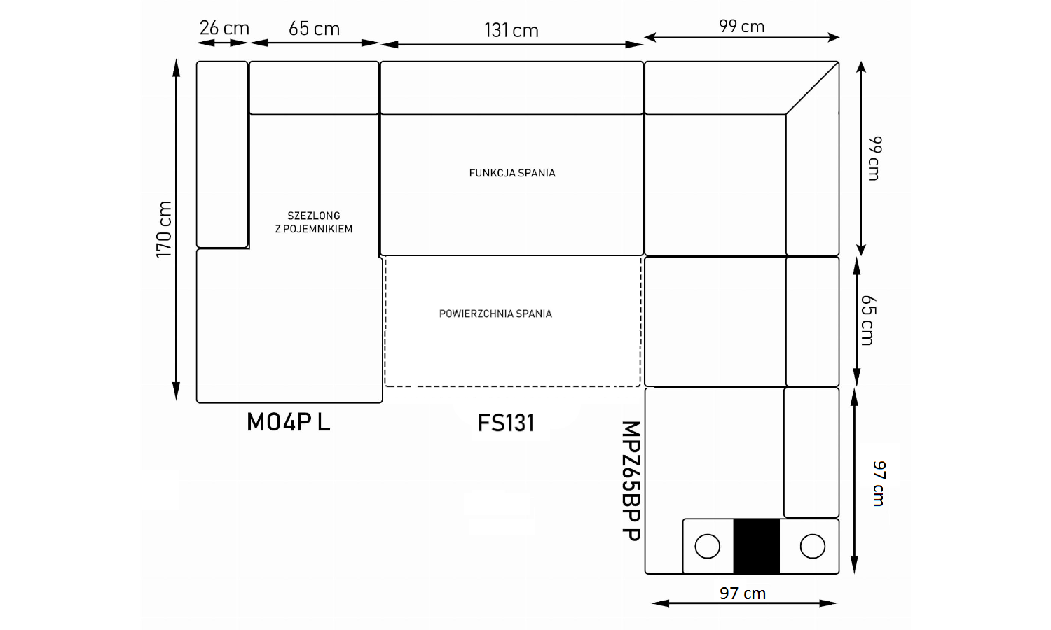 Stronę użytkowania określa bardziej wysunięty element narożnika, patrząc na mebel od frontu.