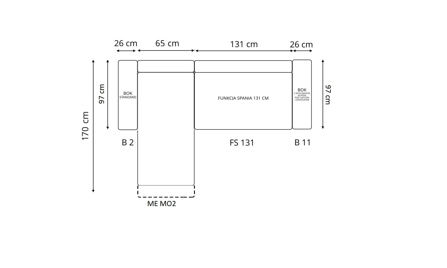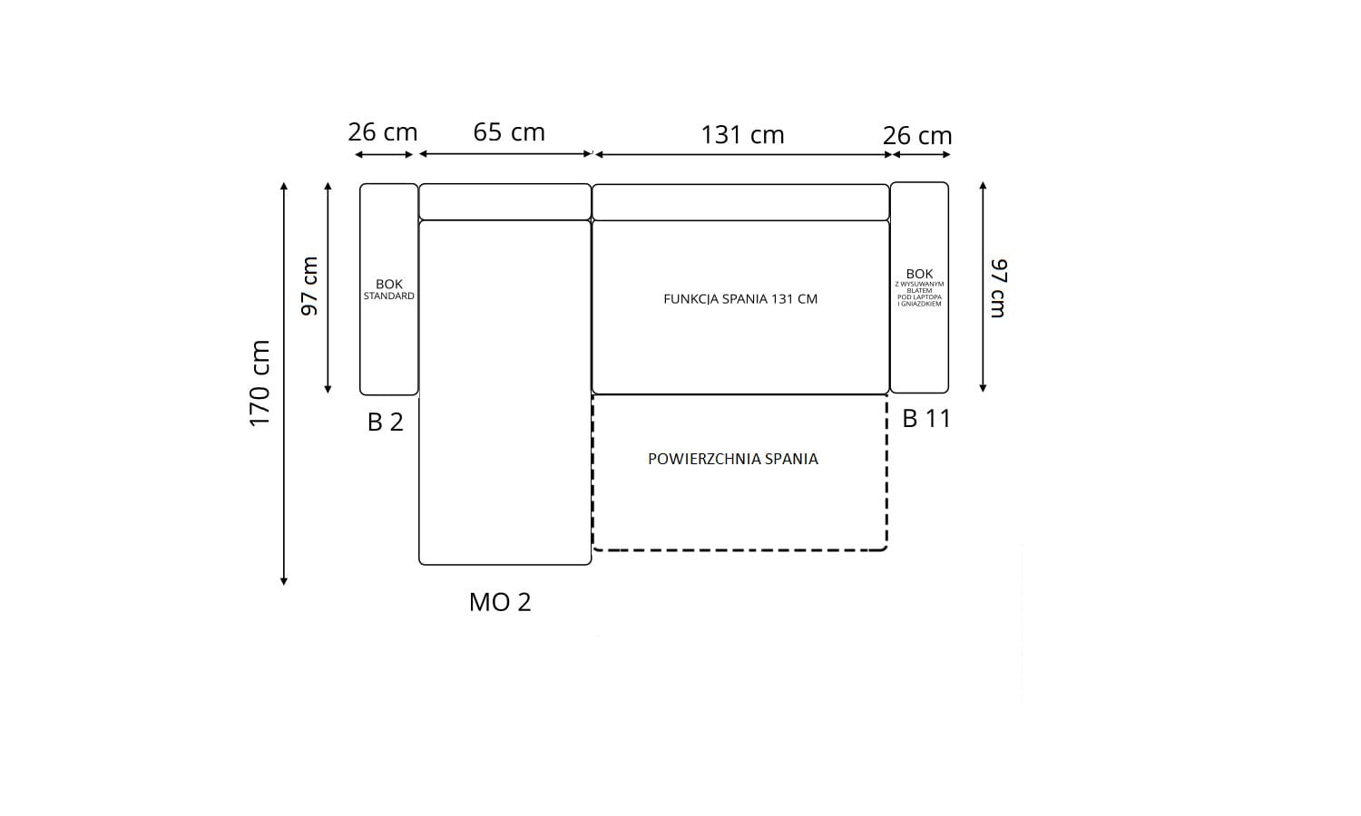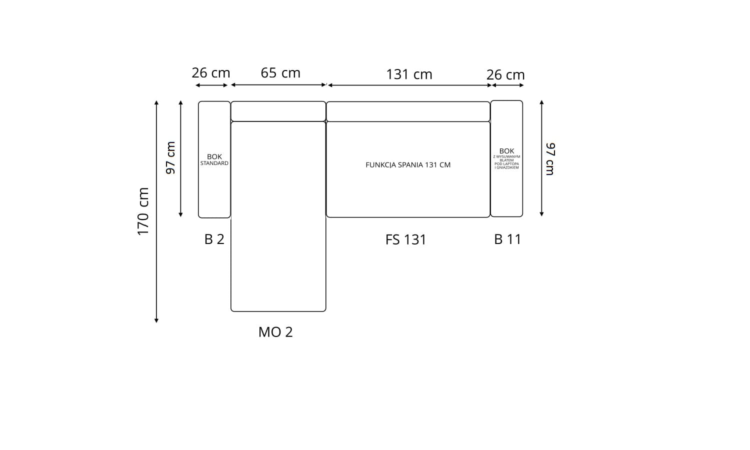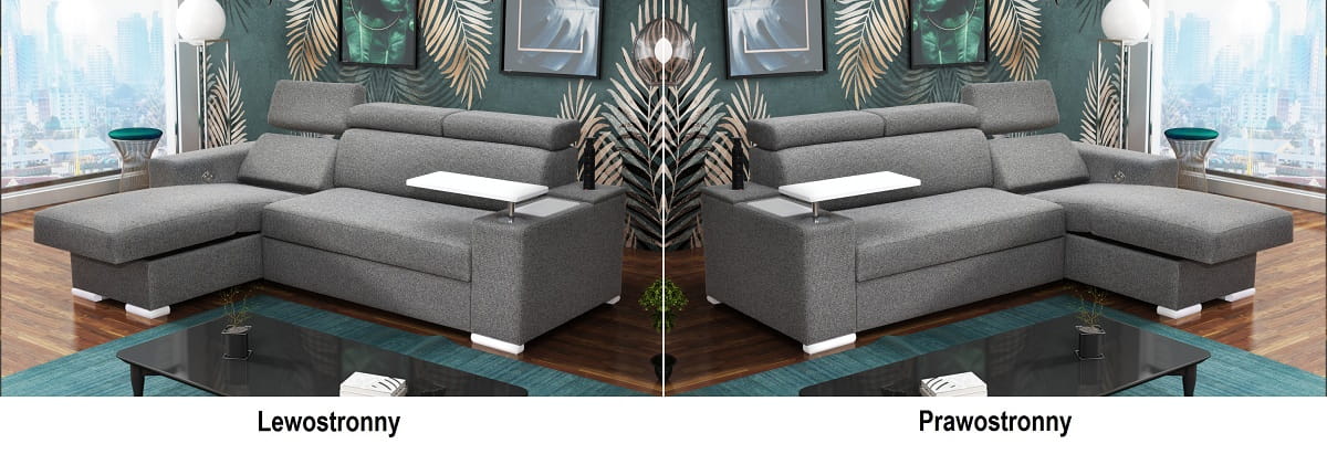 Stronę użytkowania określa bardziej wysunięty element narożnika, patrząc na mebel od frontu.