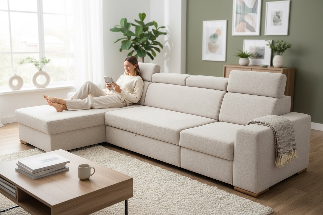 W standardzie narożnik wyposażony jest w regulowane zagłówki, pojemnik na pościel, a co najważniejsze narożnik posiada funkcję spania o sporych wymiarach. Dodatkowym plusem systemu OH Phoenix jest możliwość doposażenia swojego mebla w funkcjonalne dodatki typu rozkładany blat pod laptopa, bok z pufami, system audio, półki w bokach, ładowarki indukcyjne, podświetlane LED w pojemnikach na pościel itp.