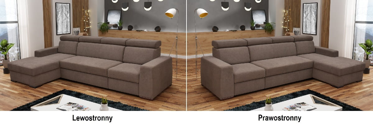 Stronę użytkowania określa bardziej wysunięty element narożnika, patrząc na mebel od frontu. Odpowiednią stronę mebla można wybrać w konfiguratorze, aby lepiej dopasować układ do wnętrza i własnych potrzeb.