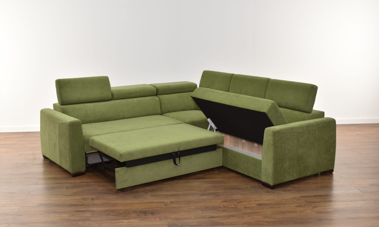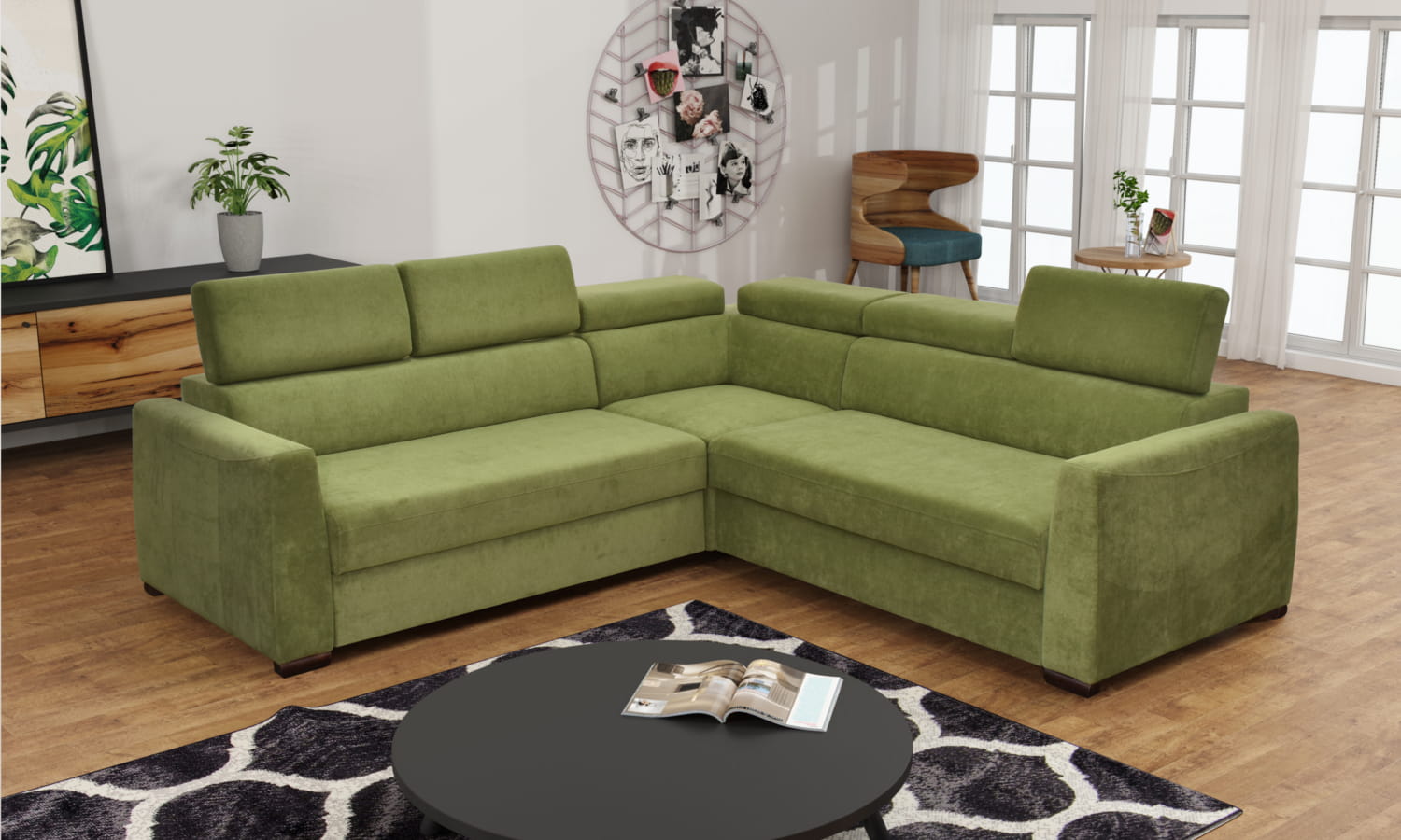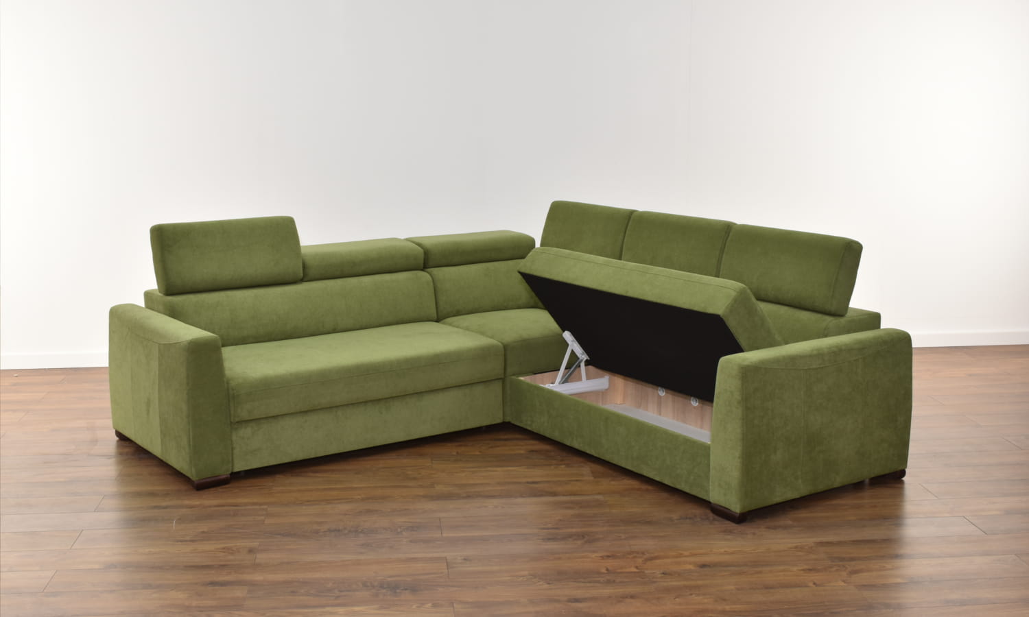 W standardzie narożnik wyposażony jest w regulowane zagłówki, pojemnik na pościel, a co najważniejsze narożnik posiada funkcję spania o sporych wymiarach.