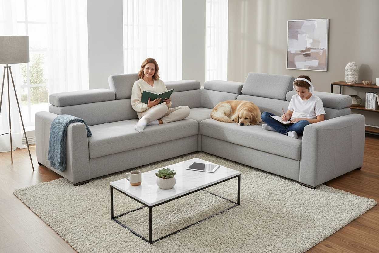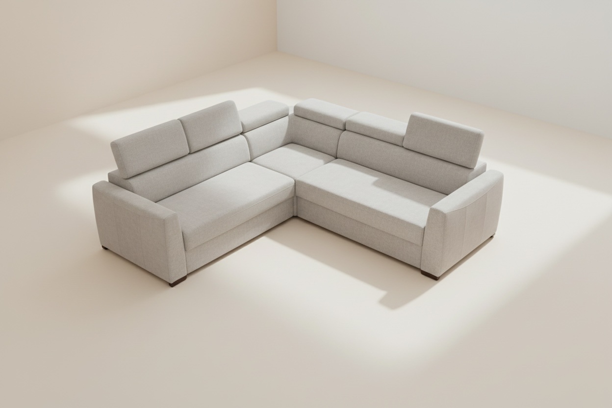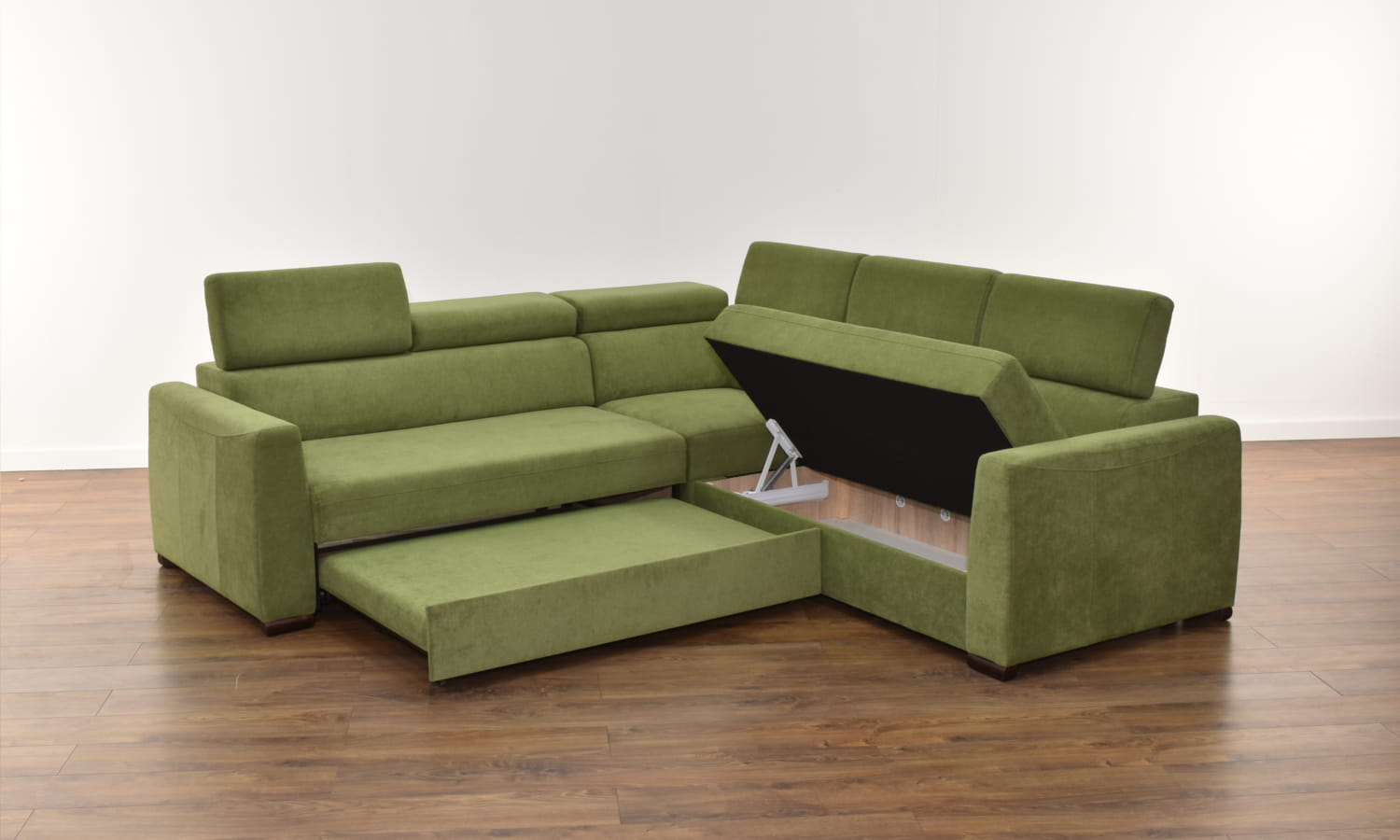 W standardzie narożnik wyposażony jest w regulowane zagłówki, pojemnik na pościel, a co najważniejsze narożnik posiada funkcję spania o sporych wymiarach.
