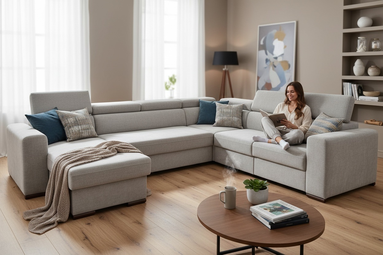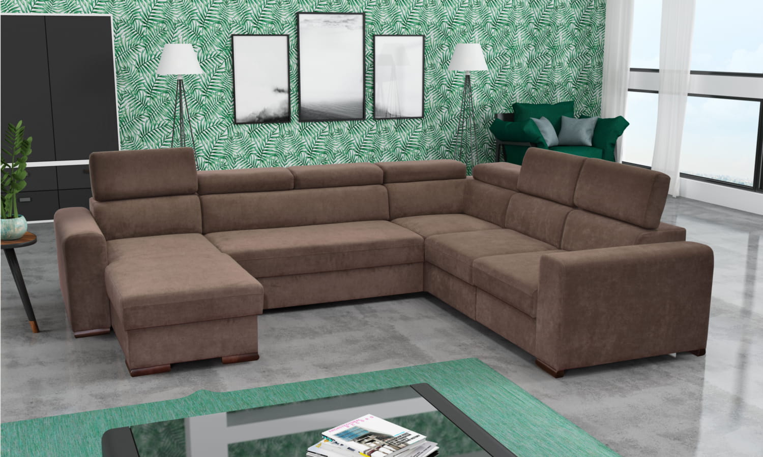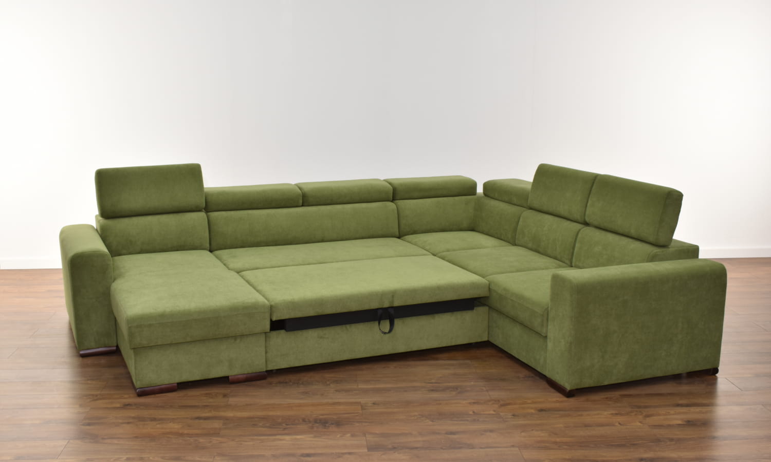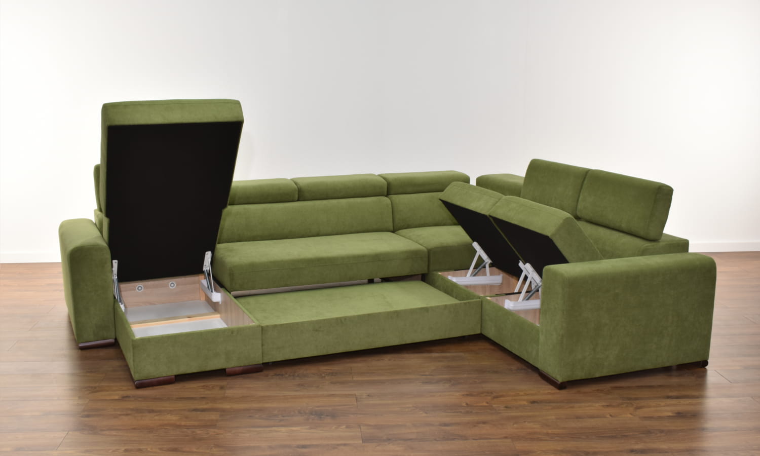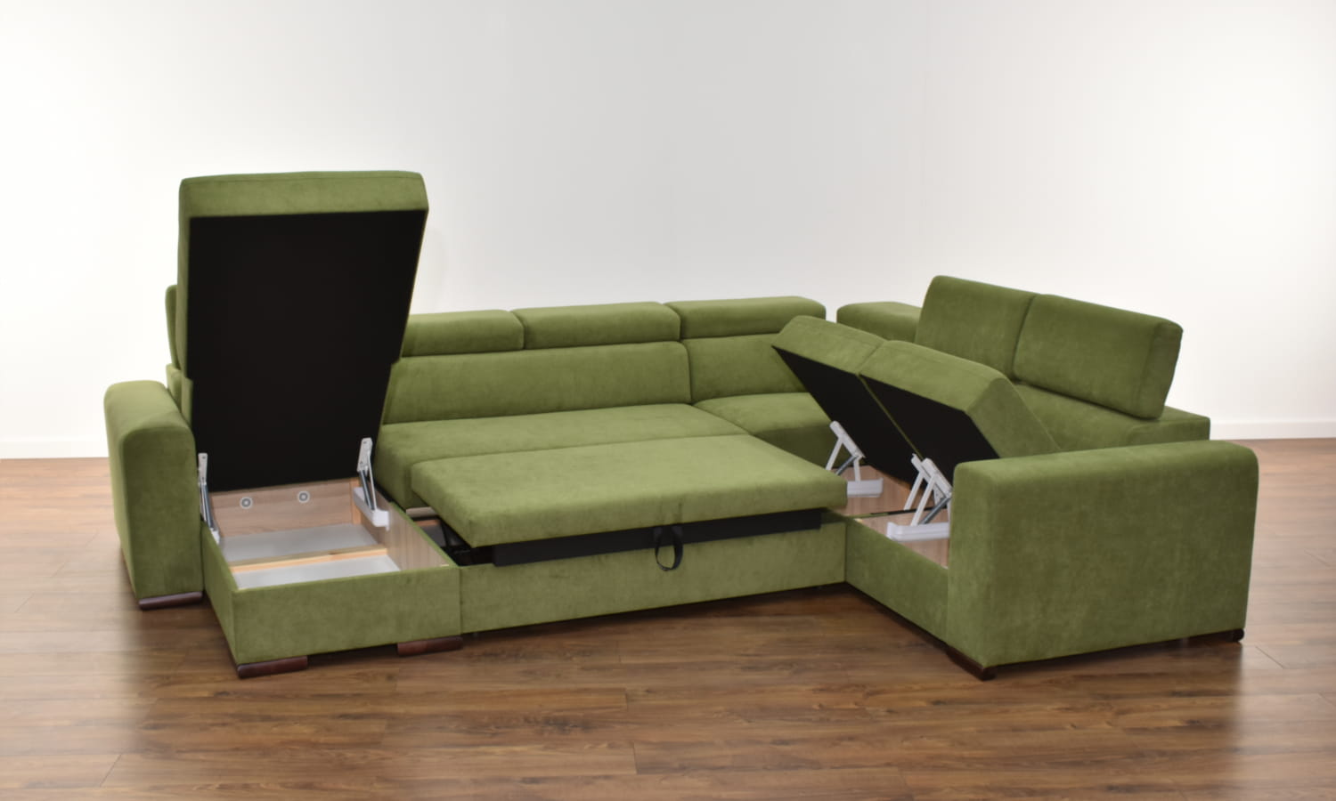 W standardzie narożnik wyposażony jest w regulowane zagłówki, pojemnik na pościel, a co najważniejsze narożnik posiada funkcję spania o sporych wymiarach.