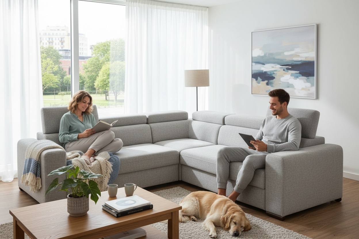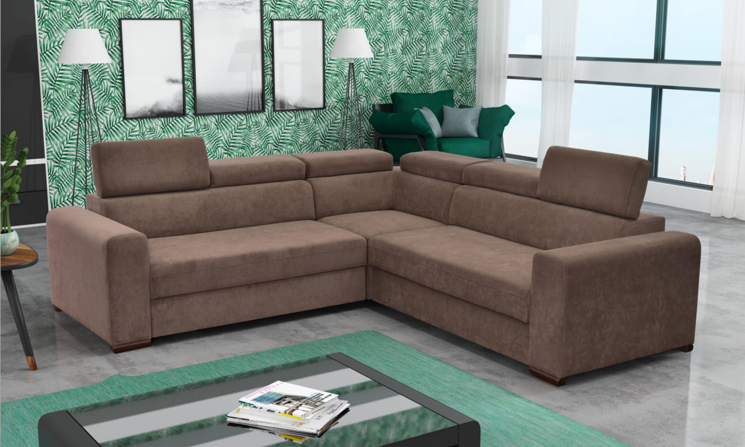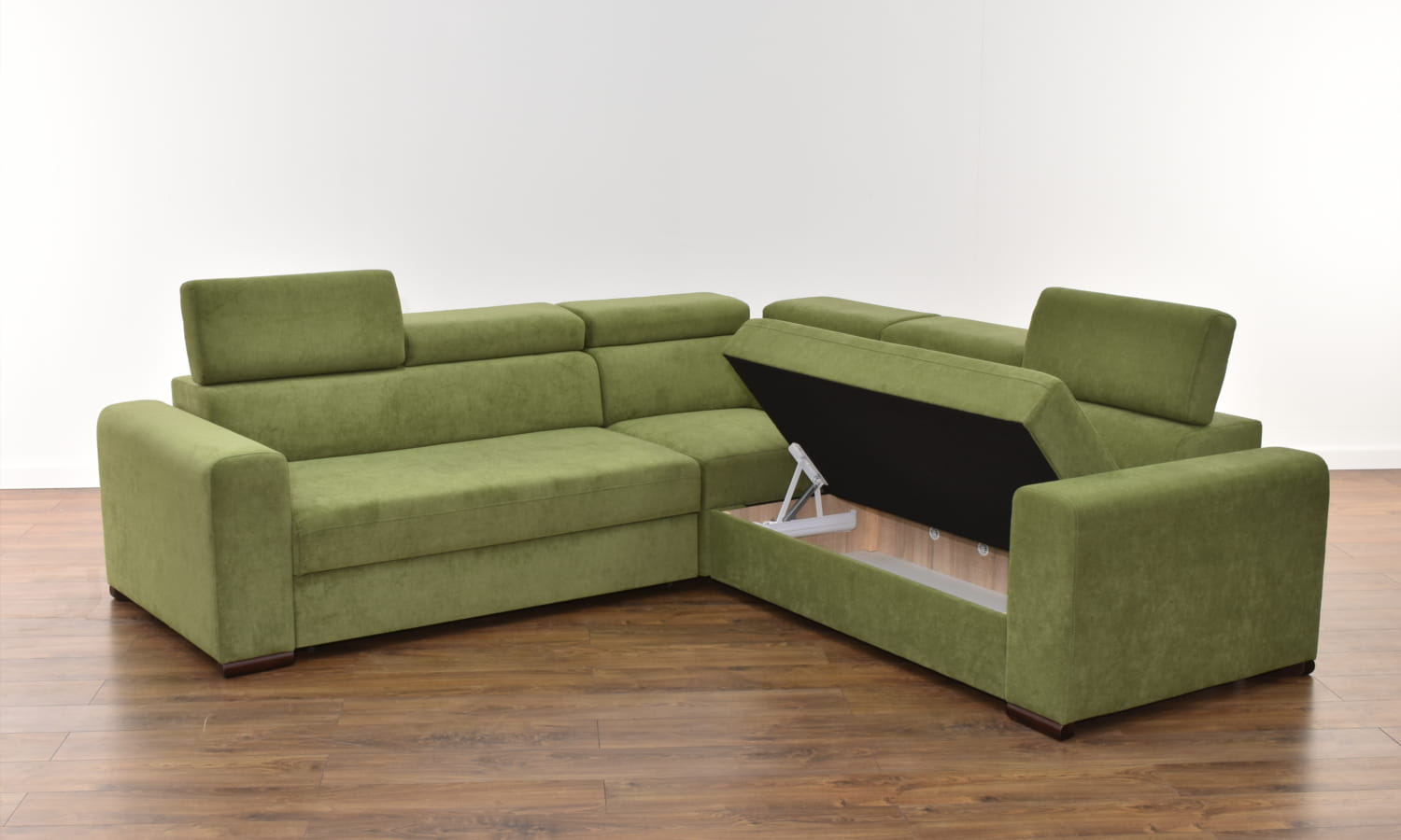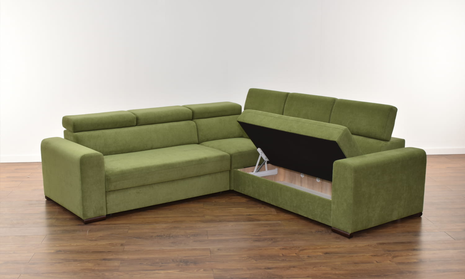 W standardzie narożnik wyposażony jest w regulowane zagłówki, pojemnik na pościel, a co najważniejsze narożnik posiada funkcję spania o sporych wymiarach.